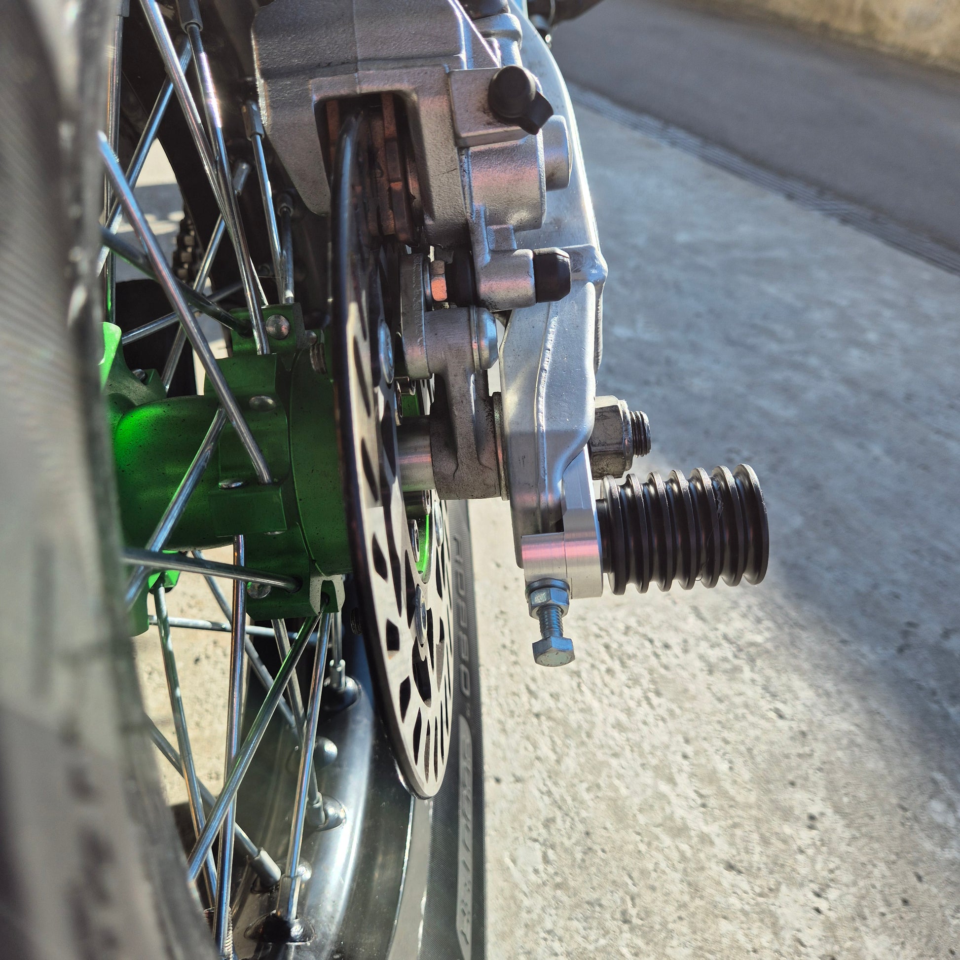 Im Gegensatz zum originalen Kettenspanner erfolgt die Einstellung jetzt außerhalb der Schwinge, wodurch die Justierung wesentlich einfacher und schneller durchgeführt werden kann. Dies spart Zeit und ermöglicht eine präzisere Anpassung der Kette.