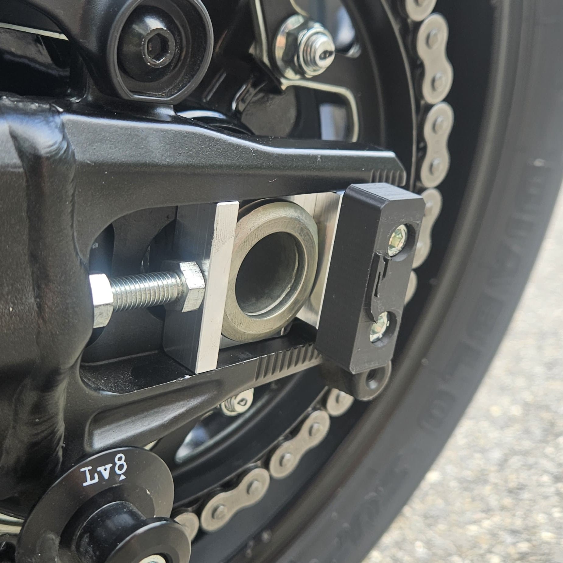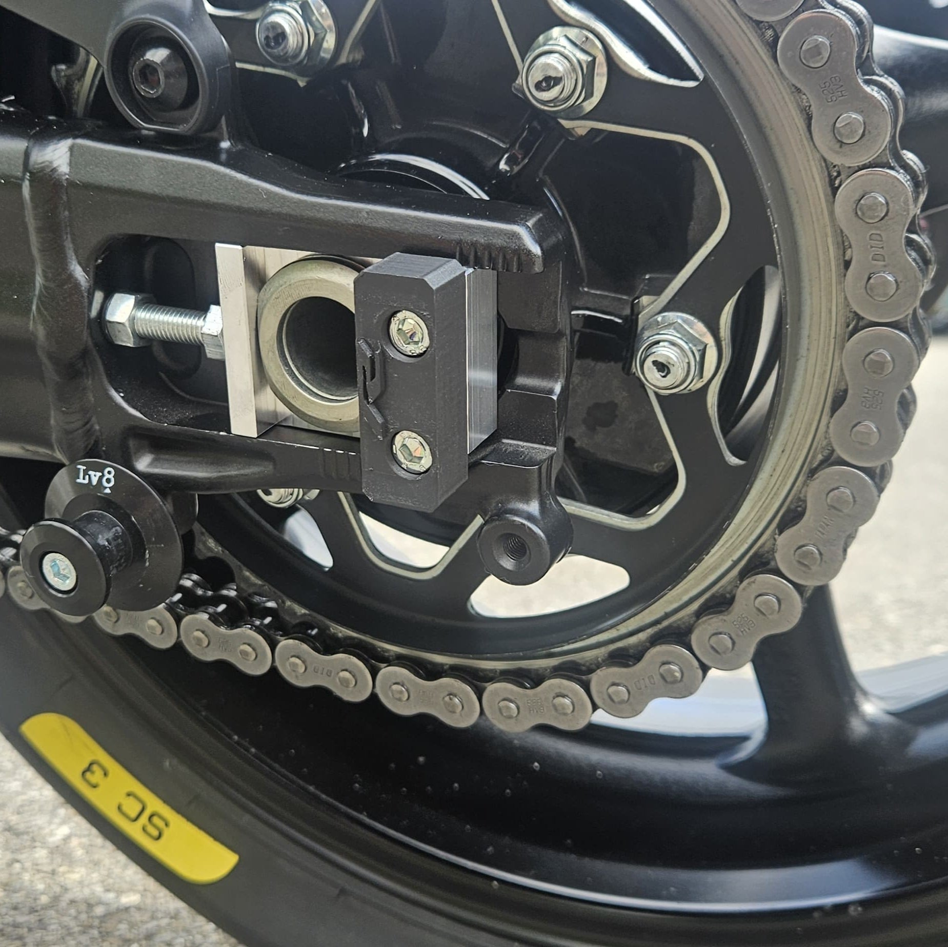 Dieses Schnellwechselsystem besteht aus den beiden Kettenspannern für die linke und rechte Seite. Der neue Distanzblock auf der Bremsseite ist mit zwei Gewinden ausgestattet, um den Hebel zu befestigen, der am Bremssattelhalter montiert wird. Dadurch kann die Bremszange beim Radwechsel problemlos an Ort und Stelle bleiben.